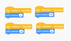 When we touch a directional arrow, the snake should change direction. Copy the 4 scripts below. Explanation: when a directional arrow is pressed (up, down, left, right), the head moves in the corresponding direction.