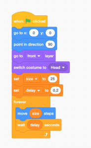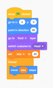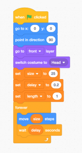 - The snake should be constantly moving. Reproduce the script below. Here’s what the code does: at the beginning of the game, the snake will be placed at the centre and will move towards the right. It will always be placed on the front layer and start with the head costume. We set the initial size variable to 25 as the size of the head is 25×25. It will constantly move in intervals of its own size.