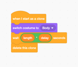 - Add the clone script (body). Explanation: we switch to the ‘body’ costume. The clone stays for a duration equivalent to the length o the snake multiplied by the movement delay in seconds and is then deleted.