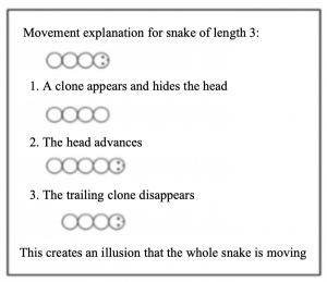 - How do we control the movement of the snake? Hint: every time the head moves forward, a clone of the body has to be created and placed in the space preceding the head. The clone remains there the time equivalent to the length multiplied by the movement delay. Thus, the longer the body, the longer the clone remains. This is how the illusion of the body is created. Add the following blocks to the movement script. Here, we are setting the initial length of the snake as 1. Just before it moves, a clone is created.