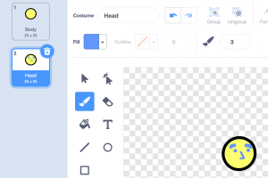 - Continue by making the head. Duplicate the ‘body’ costume and name the new one ‘head’. Draw a nose and eyes. Make sure the nose stays within the boundaries of the circle.
