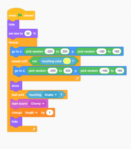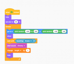 - Apples should appear randomly. When the snake swallows it, it disappears and a new one appears. Every time an apple is swallowed, the length of the snake increases by 1. Copy the below script. Explanation: first the apple is hidden. The size of the original is reduced by 30%. The following sequence is repeated indefinitely: the apple is placed randomly on the screen; it appears until touched by the snake head; a sound effect; 1 is added to the length of the snake; the apple disappears.