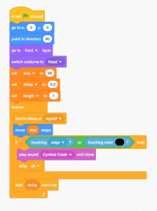 Explanation of code: after the snake moves, the game tests whether the edge or the yellow colour is touched. If either of these is the case, the crash cymbal sound effect is played and all scripts are stopped. Note that here we use the colour ‘black’ is this is the colour we chose for the outline of the snake. Note also that you need to match the colour coordinates exactly with the ones you used for the costumes.