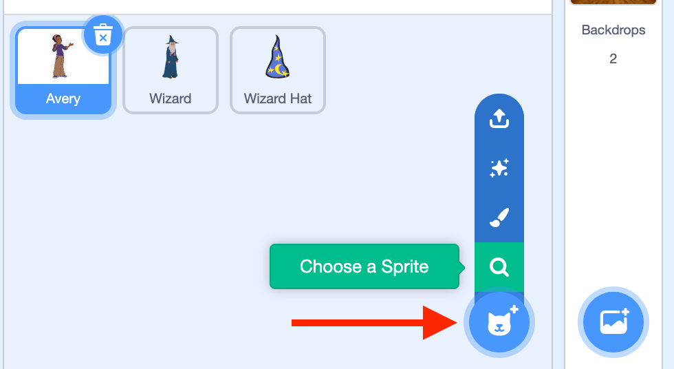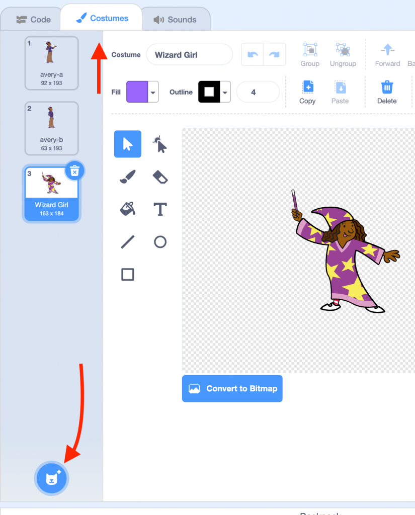 Choose the apprentice and click on the ‘Costumes’ tab on the top left. Choose a costume from the library by clicking on the sprite icon on the bottom left. We have chosen ‘Wizard Girl’ from the ‘Fantasy’ category.