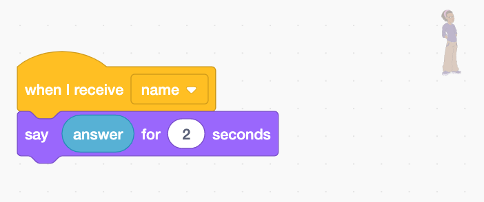 First, the character responds to the old wizard who has asked for her name. This comes about through the sending of the ‘name’ message. Copy the following to the apprentice’s script: