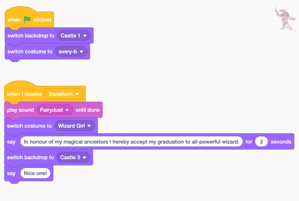 Finally, the apprentice will react when she learns she will become a wizard. She will then transform and move outside the castle. We want this change to be accompanied by a sound effect.