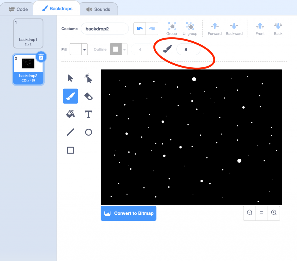 With the ‘Rectangle’ tool, make the backdrop all black. With the ‘Brush’ tool, make many white points to represent stars. The size of the points can be changed by changing the number shown below.