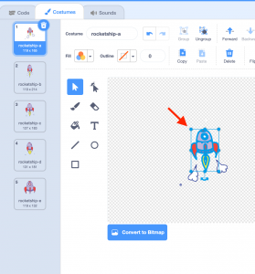 Click on the ‘Costumes’ near the top left of the screen. Now reduce the default costume to about a 5th of its initial size. Do this by selecting the ‘Select’ tool, clicking the costume on the bitmap, and clicking on one of the points on the rectangle that will appear. Meanwhile, delete the exhaust smoke graphic.