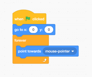 Code explanation: when the game starts, the rocket will go to the centre of the screen. It will always point towards the cursor.