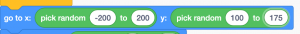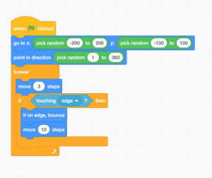 Code explanation: at the beginning, the meteor is appears randomly and will point in a random direction. In the loop (‘Forever’), it moves indefinitely (3 steps). If it touches the edge, it bounces.