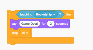 Code explanation: if the ship is touched, the meteor says ‘Game Over!’ and the program stops.