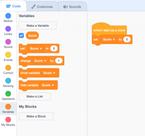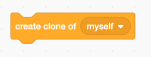 We must then change the clones’ code so that they use ‘when I start as a clone’ instead of ‘when the green flag is clicked’. How do we do this? First we copy the original code. Right click on it and click ‘Duplicate’ then change the first block to ‘when I start as a clone’. To prevent each clone from creating clones of themselves, which would make the game impossible’, remove the block ‘create clone of myself’.