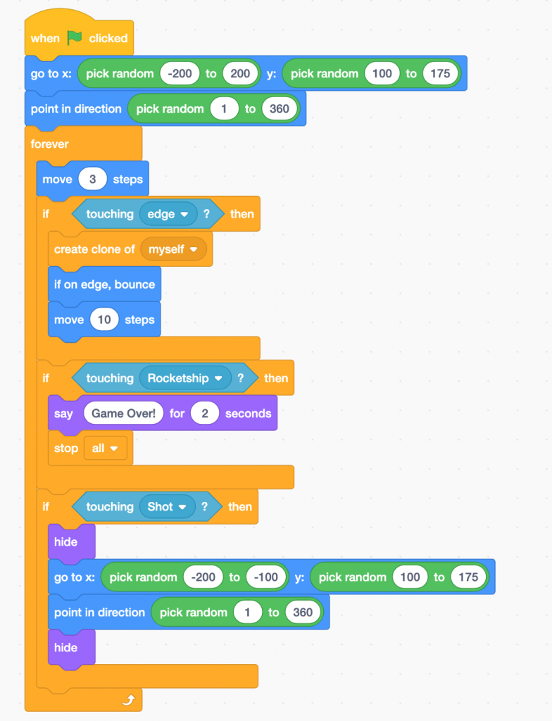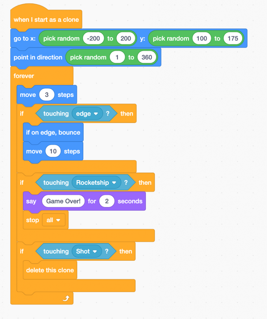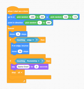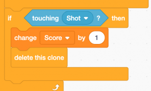 Code explanation: the ‘real’ shot hides itself under the ship and will never appear or move. However, each time the player shoots, a clone will appear and it is this that will be used. The program will create as many clones as necessary, so the player can shoot as many times as they want. Make sure you change the last block to from ‘hide’ to ‘delete this clone’.