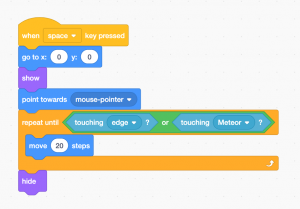 Code explanation: when space is pressed, the program places the shot at the middle of the screen under the ship (x=0, y-0) and makes it appear (‘show’). The shot moves towards where the cursor was when space was pressed. It will continue in a straight line until it touches either the edge or the meteor. When either of these things happens, it disappears (‘hide’).