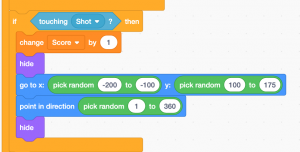 Simply add a ‘change score by 1’ block to the meteor’s script, making sure to put it in the right place. Place it within the condition that tests if the shot is touched (‘if touching shot then’):