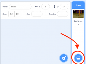 1. In the creation window, click the backdrop logo on the bottom right of the screen. Choose a backdrop from the Scratch library. You can also go to pixabay.com and search ‘Halloween’ to find a wider choice of backdrops and make the game even scarier. Add the blue bar to the right of the image by going to the ‘Backdrop’ tab on the top left page.