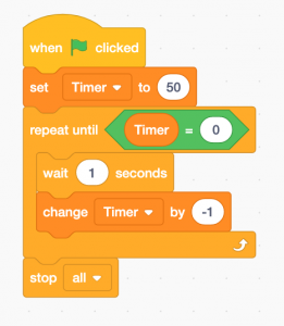 2. We will now make a timer. For this, go to ‘Variables’ then ‘Make a Variable’ and call it ‘Timer’. You can now program the backdrop. Under the ‘Code’ tab (top left), write the following script which will allow the timer to function: