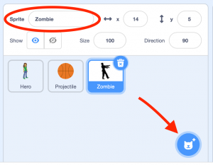 Use three sprites from the library: a player character, a projectile and a zombie (this example was taken from pixabay.com). Name them ‘hero, ‘projectile’ and ‘zombie’ respectively by clicking the field circled below.