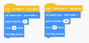 When the player presses the up arrow, the sprite points up (0°) and moves by 10 units. When the down arrow is pressed, the sprite moves down (180°) and moves by 10 units. If the edge is reached, the sprite is pushed back so as it not exit the screen. The block referring to rotation style keeps the character standing upright.