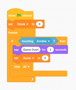 Make a new variable called ‘Score’ and apply to it to all sprites. Make it so that the game stops when the hero is touched by a zombie and that a ‘Game Over’ message appears. For this, copy the following blocks to Hero’s script.