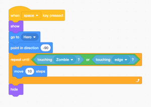 When the space bar is clicked, the sprite will appear at the level of the ‘Hero’, will move towards the left and move by 10 until it touches ‘Zombie’ or the edge of field. Then it will disappear.