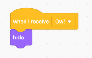 Go to the zombie’s ‘Code’ tab and copy the below blocks. When it is hit, the zombie should send the message ‘Ow!’ to all sprites.