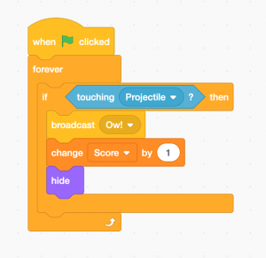 When the flag is clicked, the following condition will be constantly verified: if the ‘Projectile’ sprite is touched, the message ‘Ow!’ will be sent to all game elements (sprites and backdrop) and the value of the score variable will increase by 1.