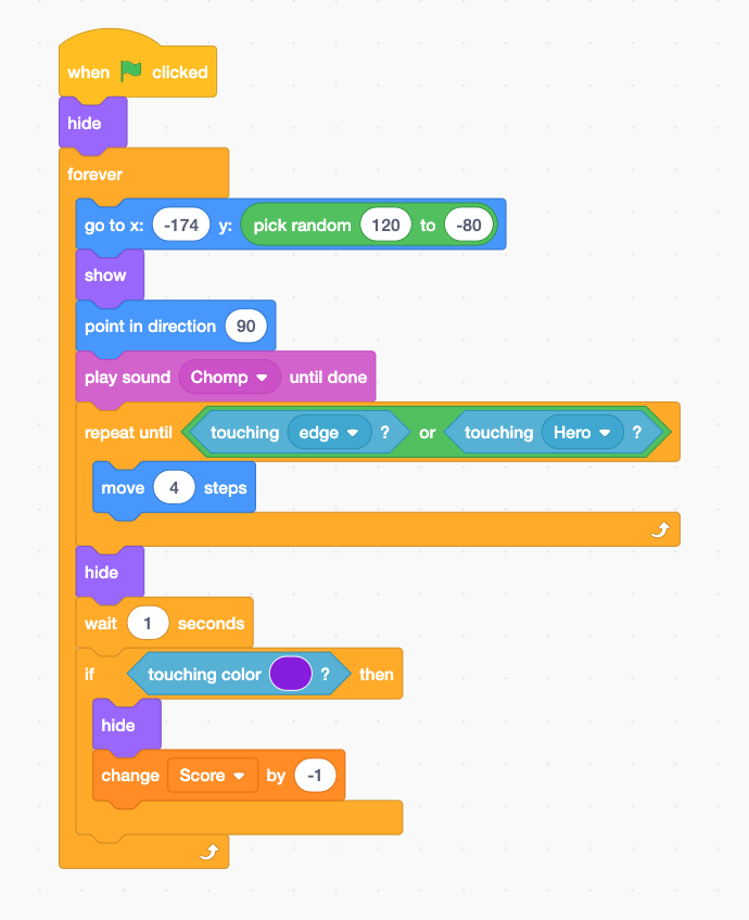 Go to the ‘Sound’ tab and click on the speaker icon on the bottom left of the screen. Use the ‘Chomp’ sound effect from the library. Now you have everything you need to program a really terrifying zombie. You can also spice up the game by having the player lose 1 point if the zombie touches the right of the screen.