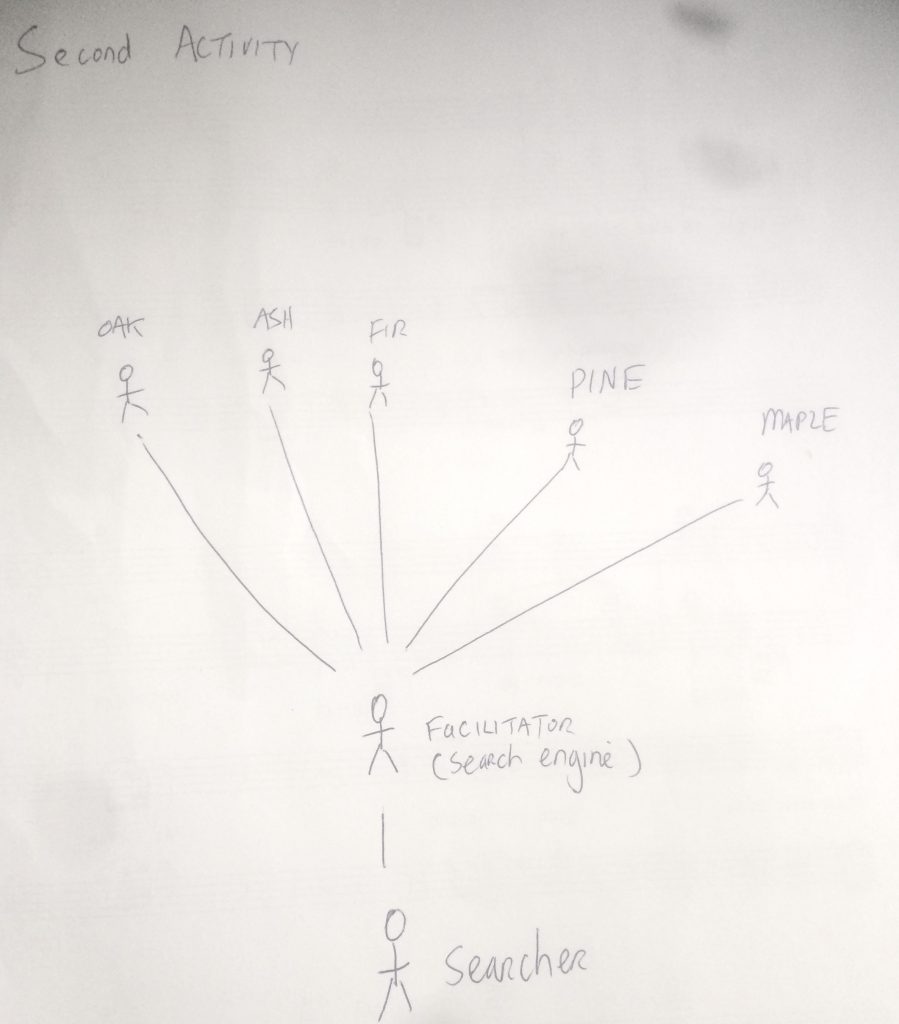 For this, everyone gets into place as with the first exercise. Each participant having a post-it will also hold a string. However, this time, the facilitator will stand between the searcher and the others. Tell the group: ‘I am a search engine. You will need to ask me the answer now. I will search for you whatever you want. I will even give you back the post-its in alphabetical order’.