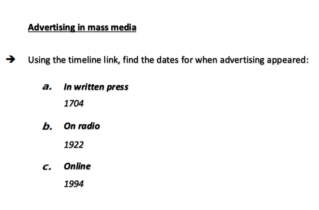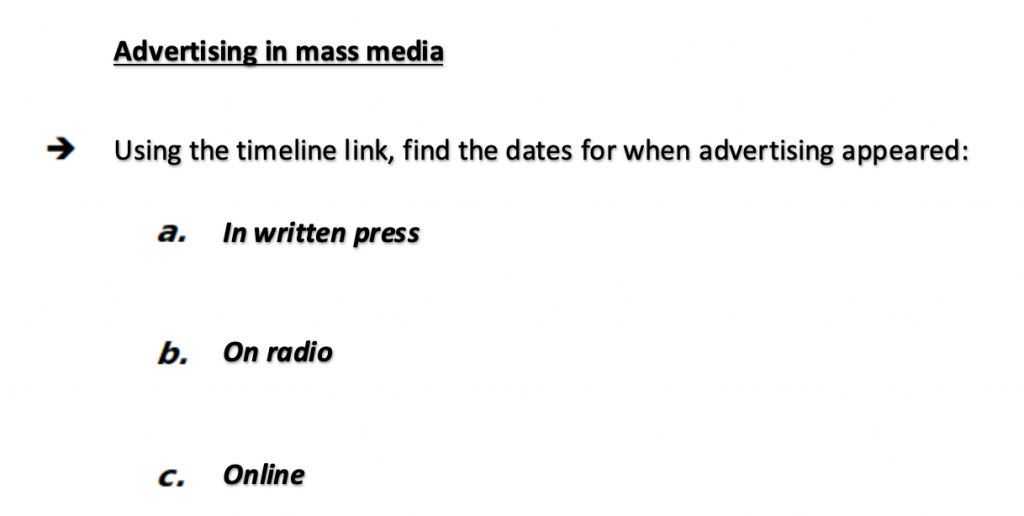 Share the link The History of Advertising: A Timeline by mail, Facebook, Whatsapp (a group could be created for the workshop), or by copying it on a whiteboard/flipchart, etc. Organise participants into several groups and ask them to fill the ‘Advertising in mass media’ sheet below.