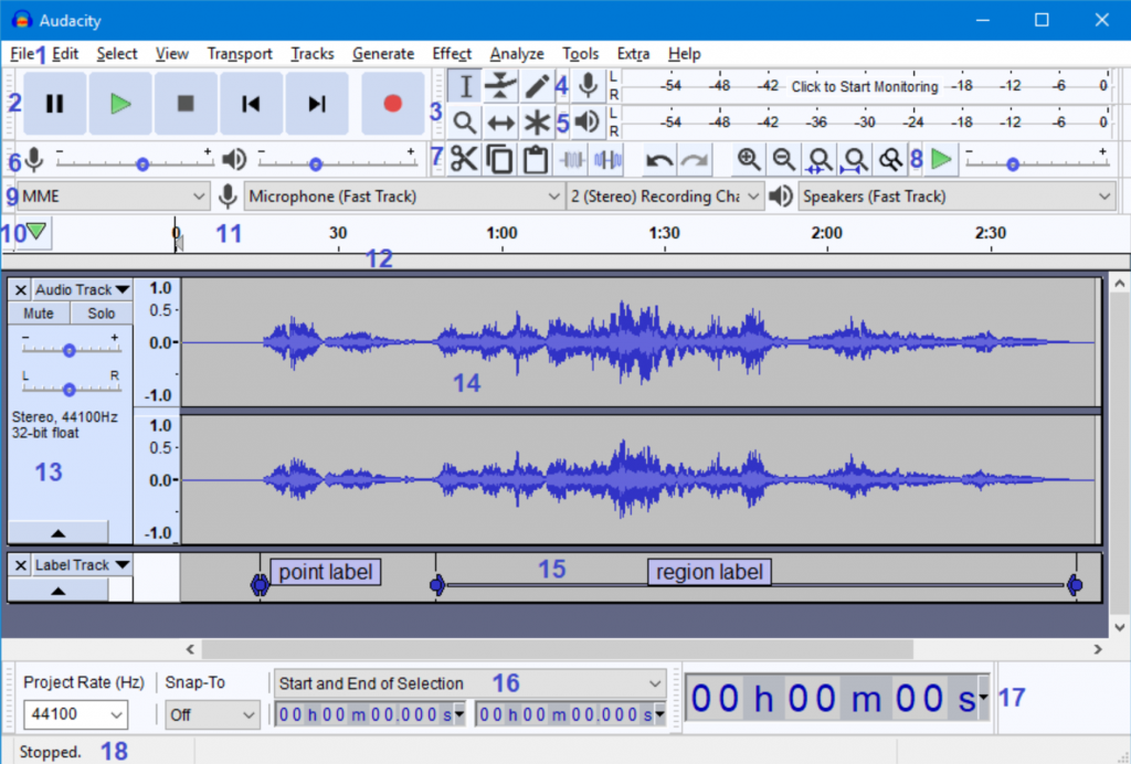 We will now look at a general overview of Audacity’s project window. You don’t need to know how everything works starting out – you will naturally build your skills through experience. We will just give a summary here to give you an idea of the possibilities available. The functionalities are numbered 1 through 17, some of which you already know from the previous steps.