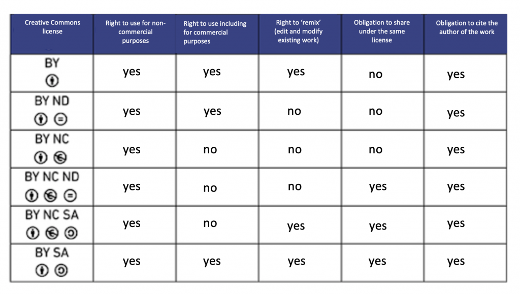 Here is a quick visual summary of the symbols and rules implicated by Creative Commons licensing systems.