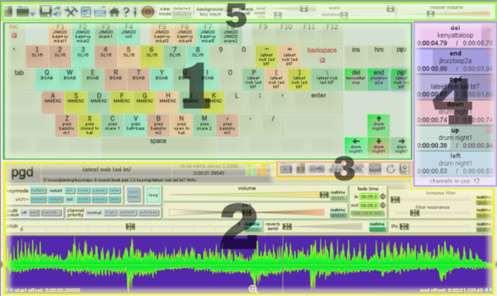 - the Key Configuration Panel on the bottom, containing controls for editing the behaviour of each key, the sound waveform, and sound property information; all of these controls pertain to individual keys