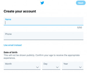 When creating an account, Twitter asks for your email address and a username (which can be your real name or a pseudonym), then for various optional personal information. An account can represent a person but also a company, a group, an organisation, etc.