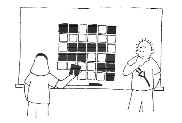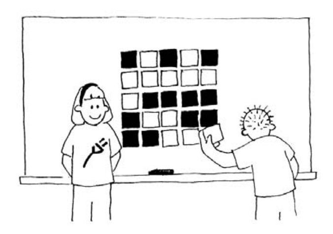 Participants should sit in pairs at different tables. Now give out the cards and they now copy what they saw before. They first make and 5×5 square. Person A adds one row and column ensuring that each includes an uneven number of face-down cards. Person B flips a card. Person A must guess which card changed its state.