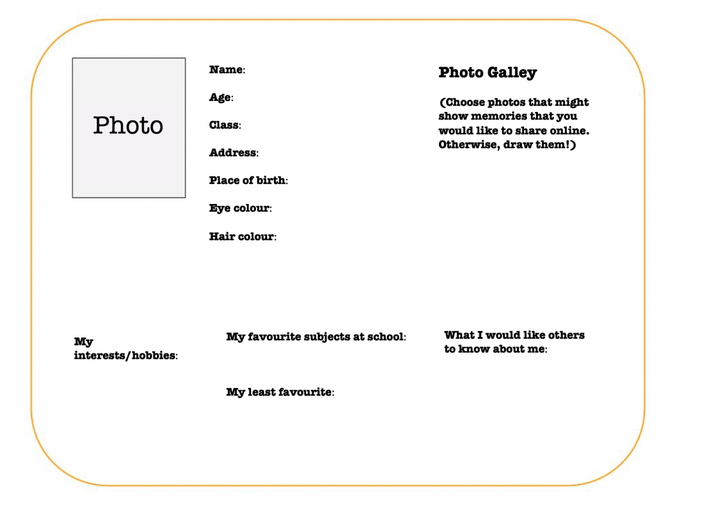 Give out a blank digital identity sheet (in annex) to each participant. If you have enough time, participants will be able to include more photos or draw pictures to explain which images they might share to add to their digital identity.
