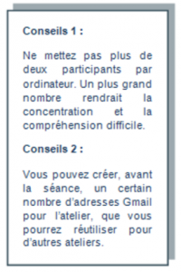 Une fois les groupes constitués et les participant.e.s prêts. Prenez le temps de connecter les participant.e.s qui n’auraient pas d’adresse Gmail aux comptes que vous aurez préalablement créés.