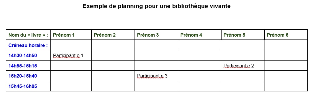 Chaque « livre » a des créneaux de 20 minutes de récit, qui sont réservables par les lecteurs.trices, entrecoupés de cinq minutes de pause (voir exemple de planning ci-dessous).