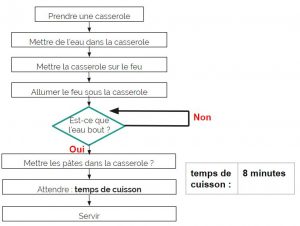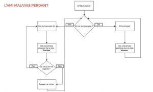 Sur ces schémas, les carrés sont les étapes de l’algorithme. Les losanges quant à eux sont des tests, des questions dont la réponse va orienter l’action suivante. Quand on arrive dessus, il y a deux chemins possibles en fonction de la réponse.