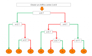 Pour deviner rapidement, il faut éliminer rapidement un maximum de possibilités. Placez les chiffres de 1 à 8 sur un axe et indiquez les sous-ensembles dont vous allez parler pour illustrer votre propos. De 1 à 8 il y a 8 possibilités. Si ma première question est à une extrémité de cet axe, par exemple « est-ce que ton chiffre est plus grand que 7 ? », il n’y a qu’une seule réponse possible (8). Si la réponse est oui, bravo, on a trouvé en un seul coup ! Mais il faudrait beaucoup de chance pour que ça arrive ; et si la réponse est non, il reste encore sept réponses possibles ! On n’a donc pas réduit beaucoup le nombre de possibilités. Alors que si on pose une question pile au milieu de l’axe (« Est-ce que ton chiffre est plus petit que 4 ? »), peu importe que la réponse soit oui ou non, il ne restera plus que quatre possibilités. On a réduit le nombre de possibilités de moitié, autrement dit on est déjà à la moitié du chemin vers la solution ! Observez maintenant le schéma de l’algorithme : à chaque étape, on se place au milieu des possibilités restantes. C’est comme ça qu’on obtient le chemin le plus rapide vers la solution. Et peut importe le chiffre choisi, il n’y aura toujours que trois, maximum quatre, questions.