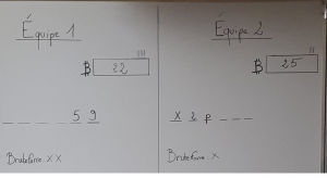 Diviser le tableau en deux, déterminer une somme, similaire pour les deux équipes mise de chaque côté du tableau (30 bitcoins par équipe par exemple), il s’agit du nombre de points que chaque équipe dispose pour jouer. Toujours de chaque côté du tableau tracer un nombre de tirets équivalent au nombre de caractères des mots de passe de chaque groupe (même concept que le pendu).