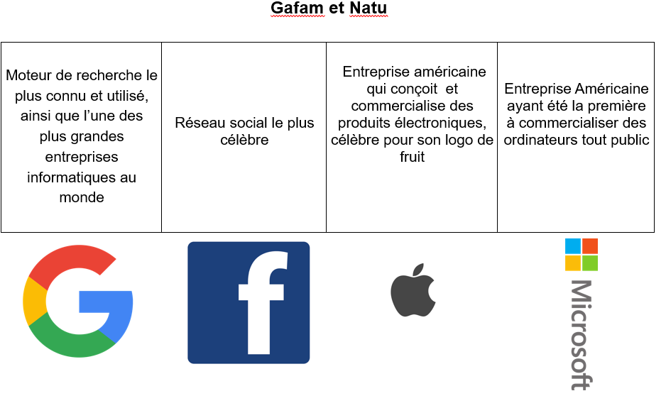 • Gafam et Natu : Google / Facebook / Apple / Microsoft / Netflix / Amazon / Uber