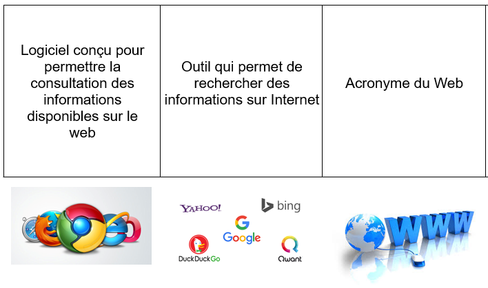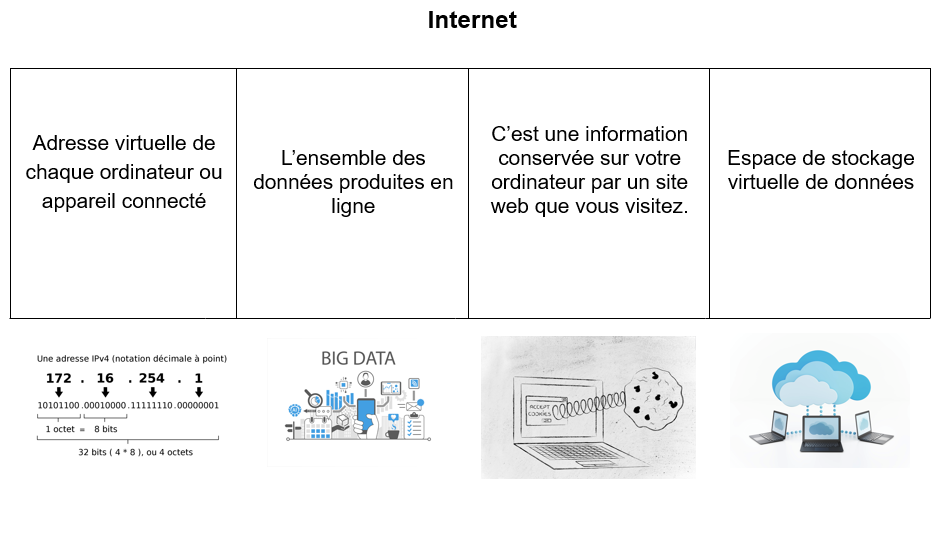 • Internet : Adresse IP / Data (ou big data) / Cookies / Cloud / Navigateur Web / Moteur de recherche / World Wide Web