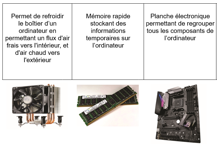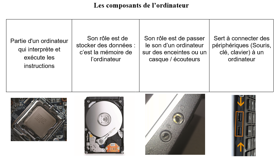 • Composants ordinateur : Processeur / Disque dur / Prise Jack / Prise Usb / Ventilateur / Ram (ou mémoire vive) / Carte-mère