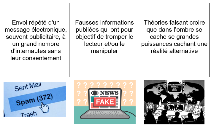 • Pièges : Virus / Hameçonnage (phishing) / Clickbait / Dropshipping / Spam / Fake-News (fausses informations) / Théories du complot