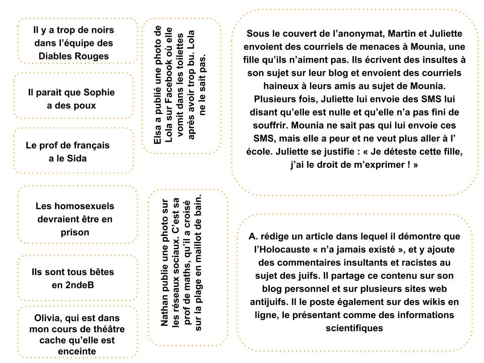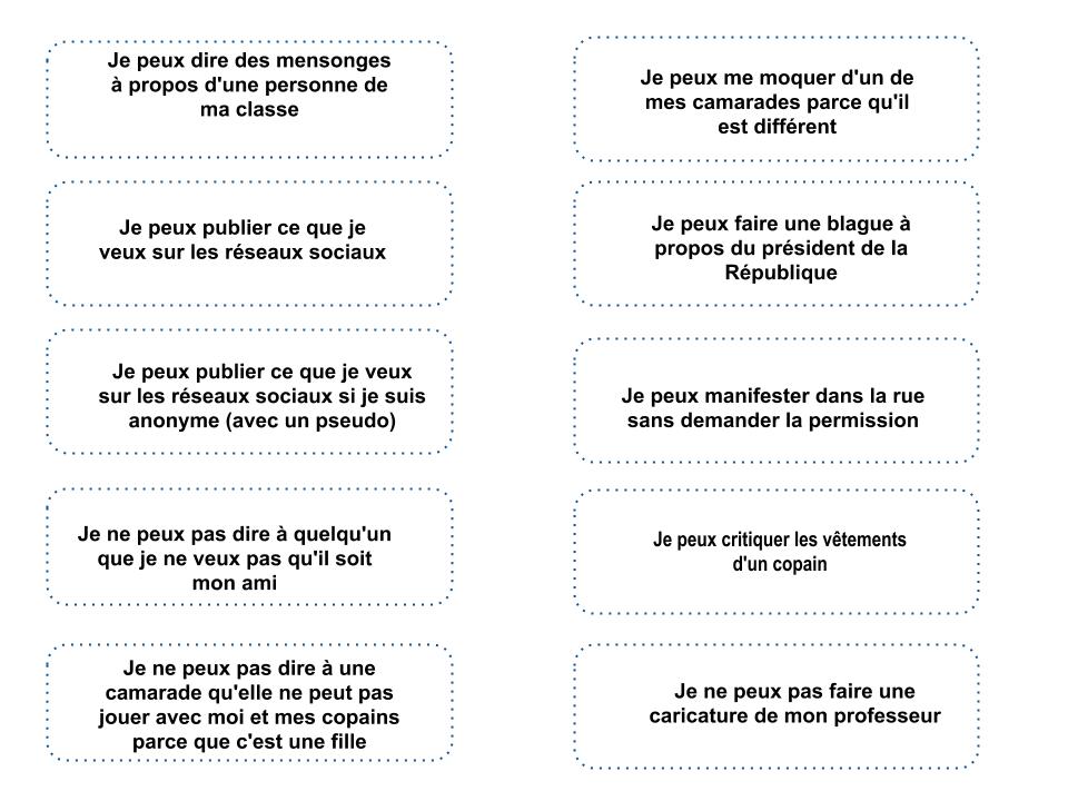 A travers deux petites activités, l’objectif est de pouvoir aborder les notions relatives à la liberté d’expression en ligne et du respect de soi et des autres. Cela à travers un débat mouvant autour de ce que l’on peut dire ou pas sur Internet, puis autour du sujet plus large qu’est la liberté d’expression et des lois qui existent à ce propos.