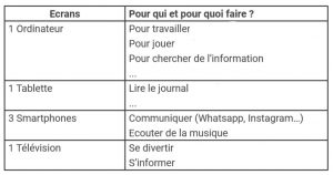Les participant.e.s commencent par dresser un inventaire des écrans chez eux sur une feuille de brouillon. Il est conseillé de les aiguiller avec ces questions : Combien d’écrans y a-t-il chez vous ? Pourquoi vous servez-vous de cet écran ?