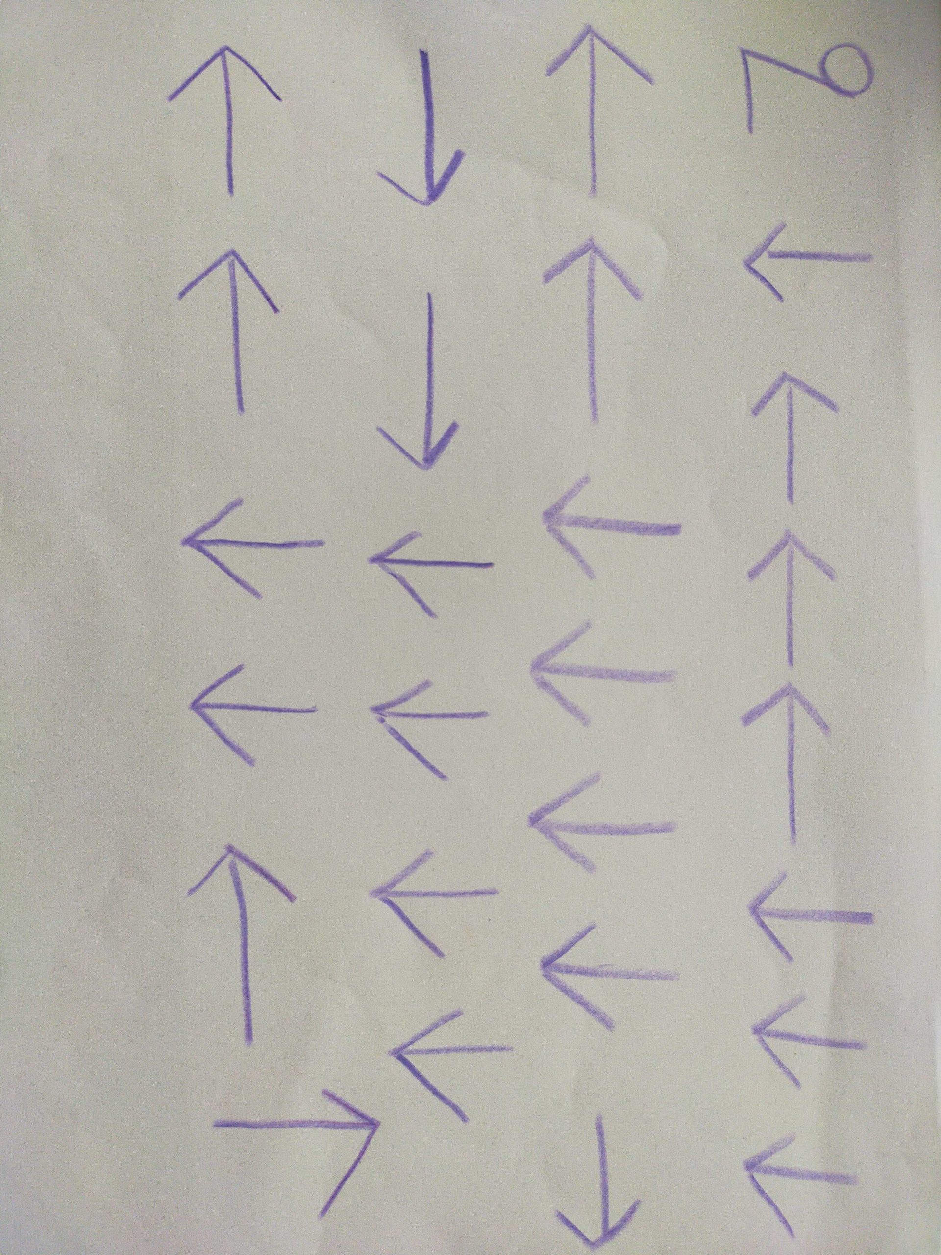 Robot idiot : sur le tapis on dispose écrit des chiffres au hasard, le code fléché doit aider les participant.e.s à trouver le chiffre (une partie du code qui ouvrira la pochette). Sur le code fléché il faut en premier lieu écrire un chiffre qui ne sera écrit qu’une seule fois sur le tapis : c’est ce chiffre que les participant.e.s doivent trouver afin de commencer le parcours fléché.