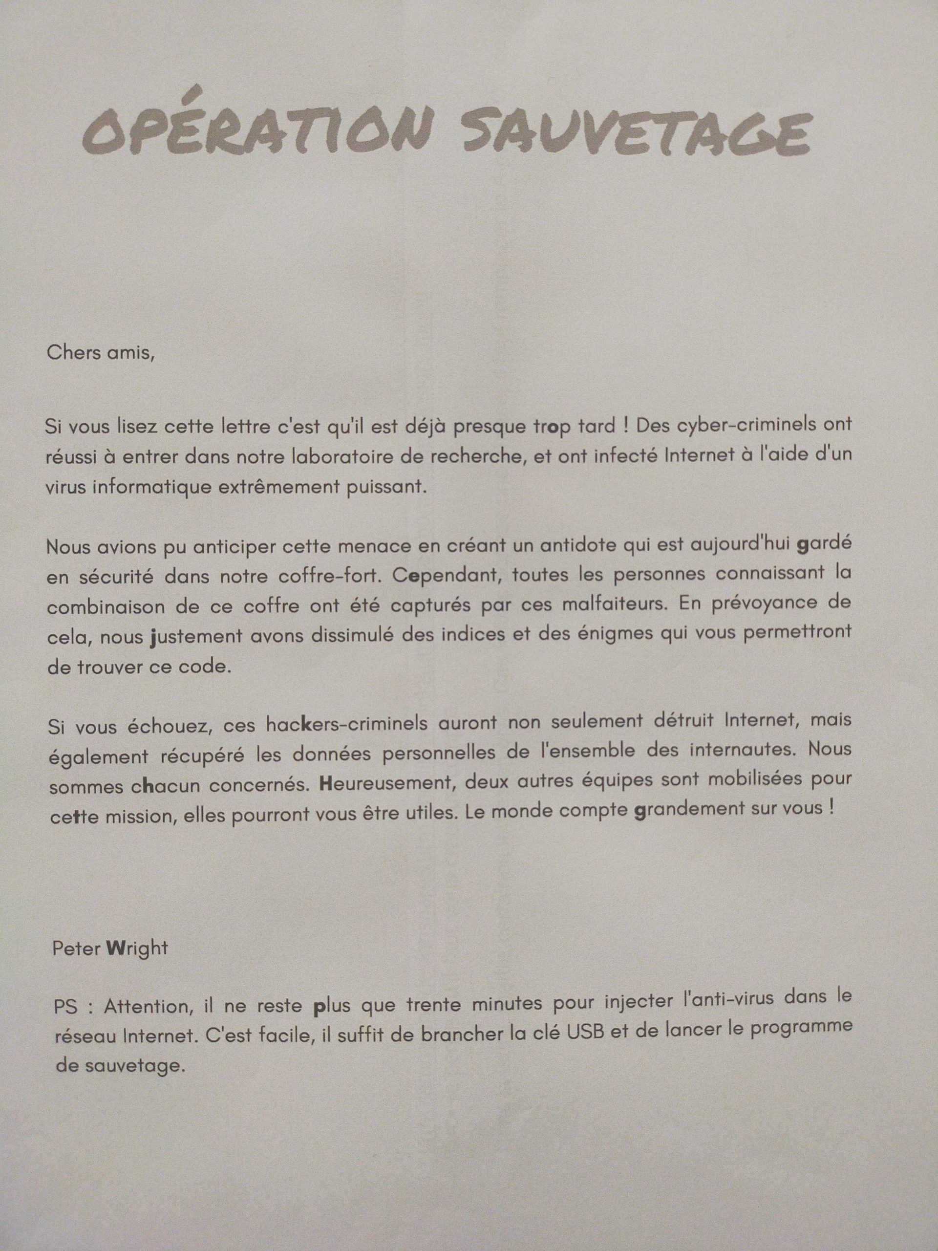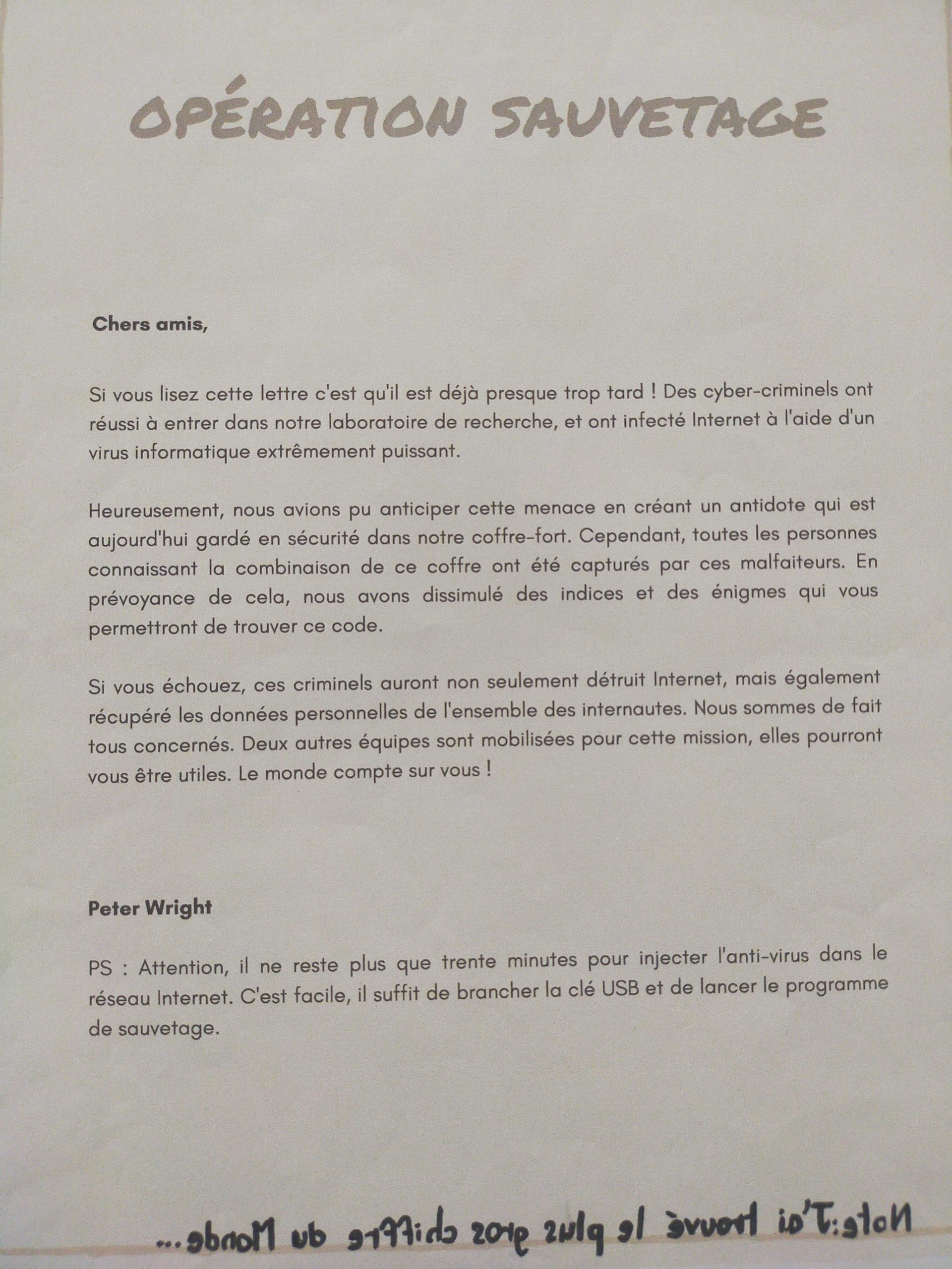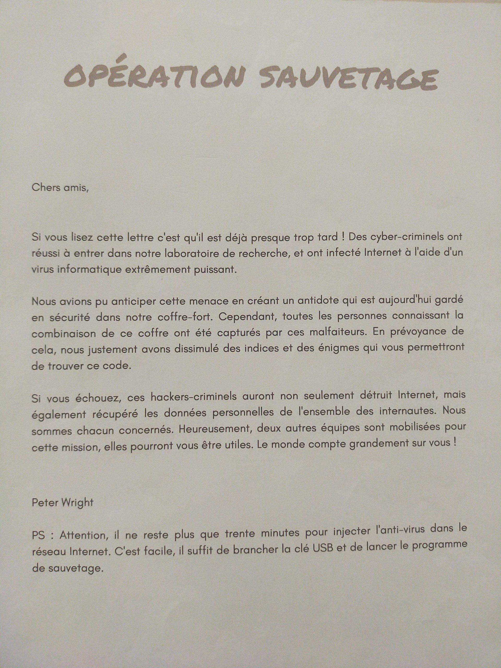 Hacking mondial, sans intervention des participant.e.s dans les 30 minutes, un virus se propagera dans l’ensemble des logiciel. Il existe toutefois un antidote, sous forme de clé USB, qui branchée à un ordinateur empêchera le virus de sévir. Cet antidote a été conçu par un professeur qui est malheureusement aux mains des hackers. Il a toutefois par précaution laissé un exemplaire de cet antidote dans un coffre fort cadenassé par un code. Pour l’ouvrir, des énigmes ont été disséminées dans la pièces, chacune permettra d’approcher étape par étape le code du coffre fort.