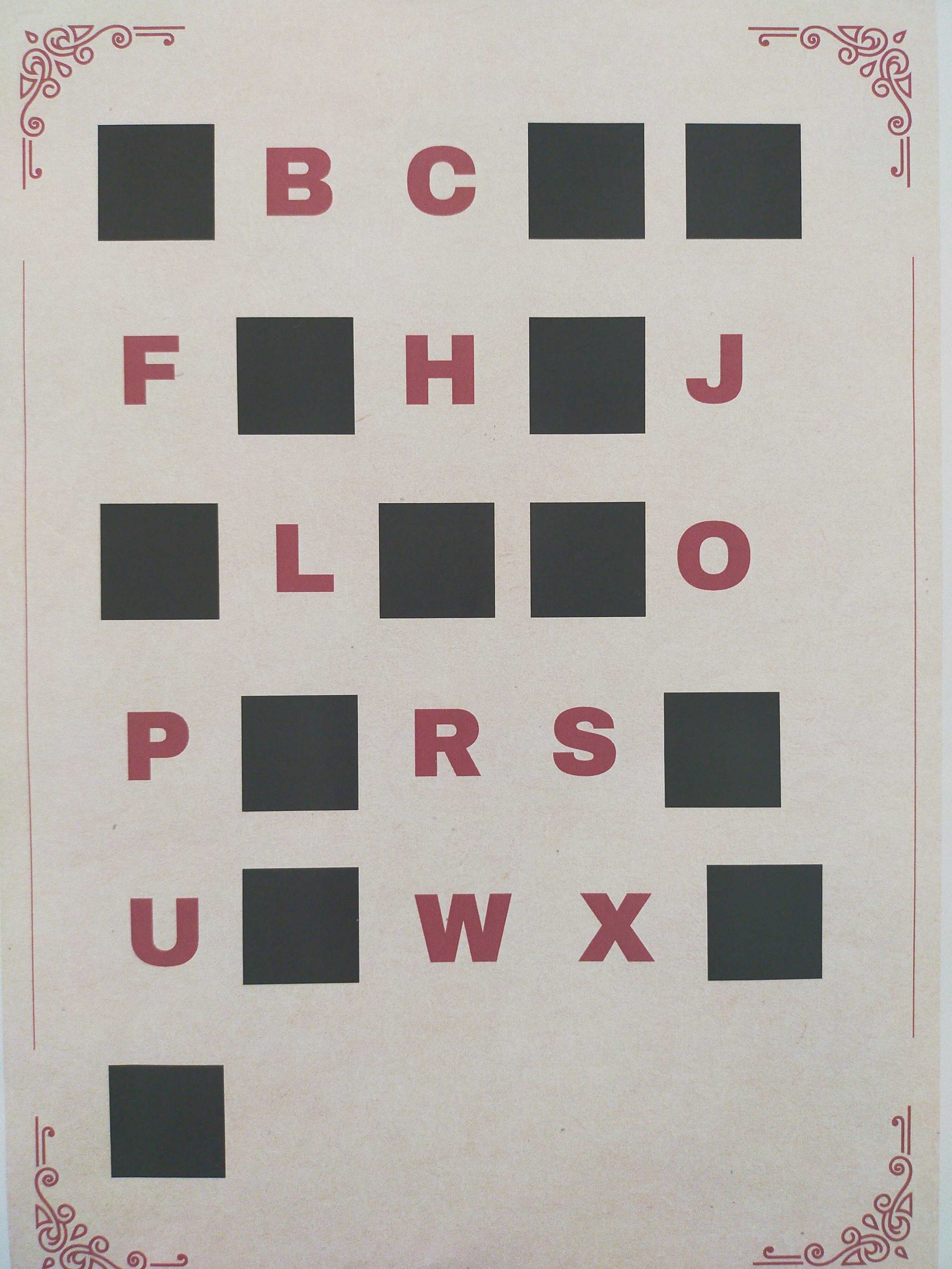 - Indice dans l’enveloppe : Alphabet avec des cases noires (à imprimer).